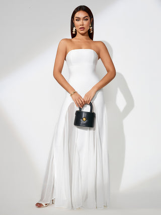 White bandage dress with pleats detailing to give it a flowy look. Designed with precision and crafted from luxurious fabrics, this ensemble effortlessly blends elegance with modern sophistication. Perfect for grand occasions, parties, or special evenings, it promises a flattering fit and an unforgettable impression. Style it with statement accessories and heels to complete your look.