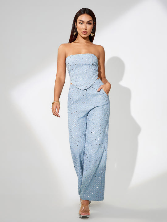 Make a bold statement in this embellished denim co-ord set. The corset-style top hugs the torso beautifully, while the wide-leg pants create a flattering silhouette. Embellishments add a hint of glam, making it a standout choice...Regular price Rs. 10,000.00 -