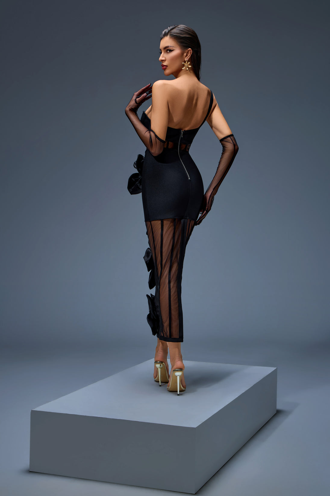 Sculpted to perfection, this corset dress is enhanced with artistic 3D flower detailing, offering a sophisticated yet modern aesthetic.