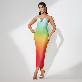 Shimmer and shine in this vibrant rainbow sequin dress, perfect for parties and festive occasions. Complete with bold heels and minimal jewellery to let the dress shine.