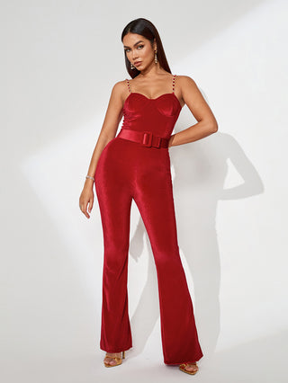 Chic and modern, this red velvet jumpsuit is perfect for fashion-forward evenings. Pair with high heels and a sleek clutch for an elevated look.