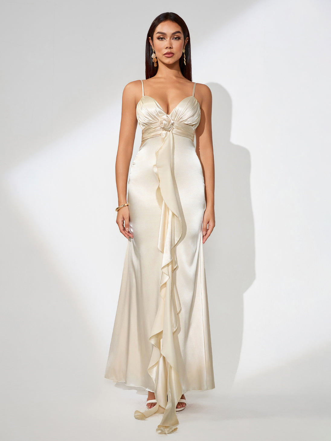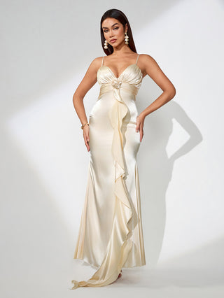 Crafted from fluid satin, this waterfall dress drapes beautifully across the body. A versatile piece for elegant dinners or cocktail evenings, accessorize with metallic heels and bold earrings for a statement finish.