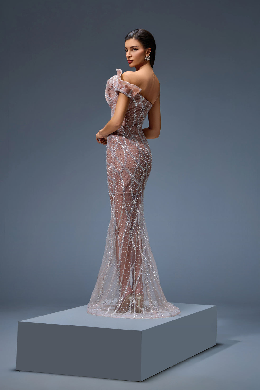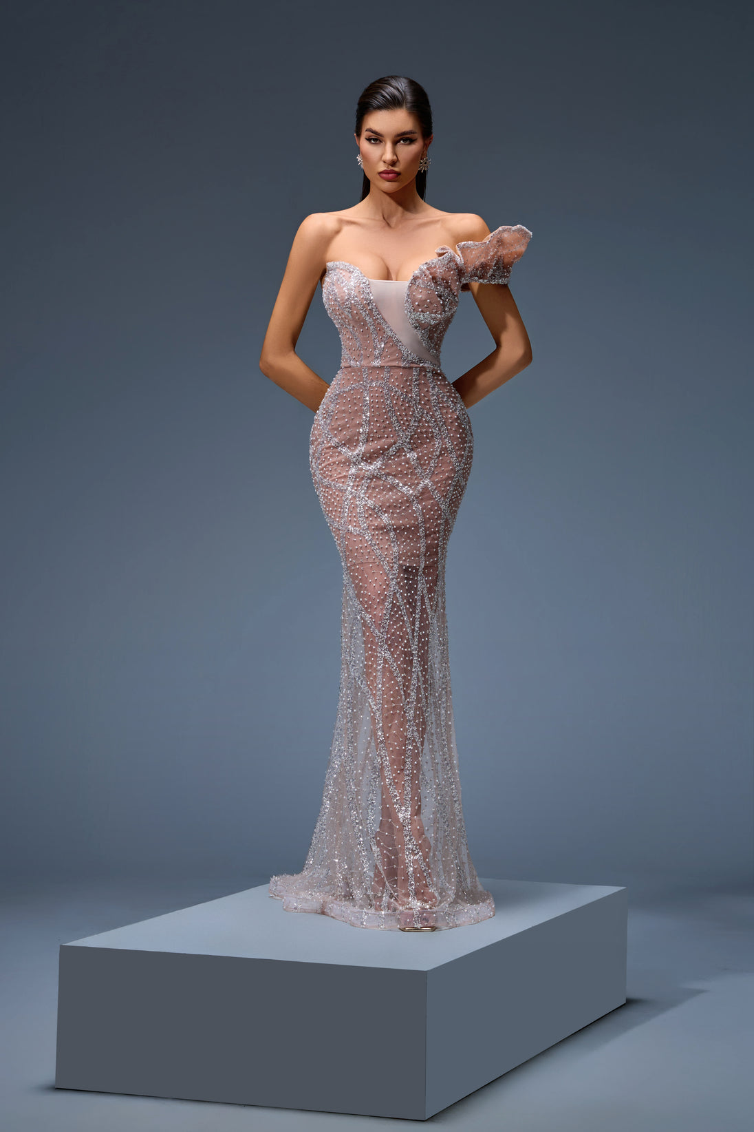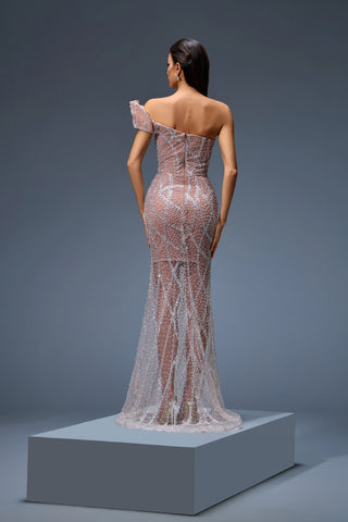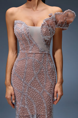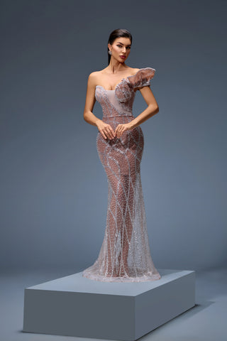 This beige gown, adorned with silver embellishments, radiates pure sophistication. A flawless pick for weddings or gala nights.
