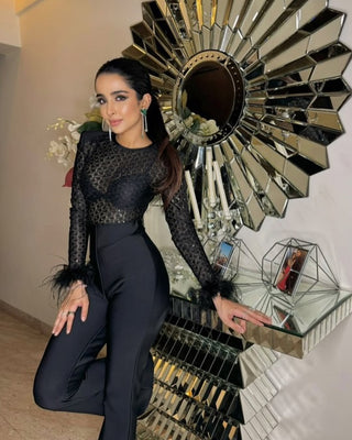 Turn heads wherever you go in this stunning Black Lace Sequin Jumpsuit. Featuring an intricately designed sheer lace bodice embellished with delicate sequins, this jumpsuit is the perfect blend of elegance and allure. The high-waisted fitted pants elongate your silhouette, while the feather-detailed sleeves add a touch of drama and sophistication.