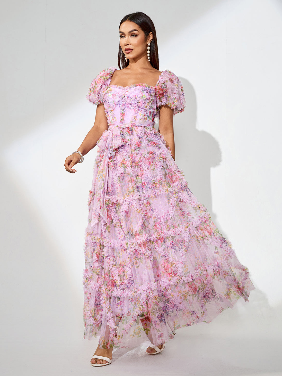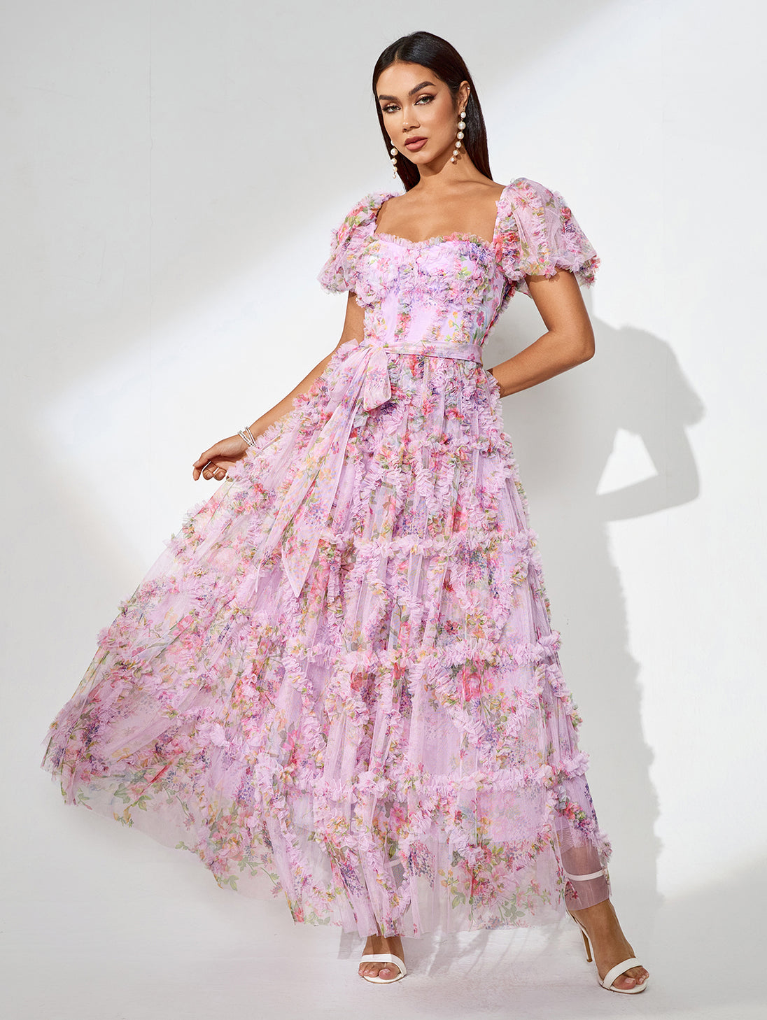 This lilac floral tulle dress blends puff sleeves and ruffles to create an airy, princess-like effect. Ideal for afternoon tea parties or dreamy photo shoots, complete the look with strappy heels and pearl studs.