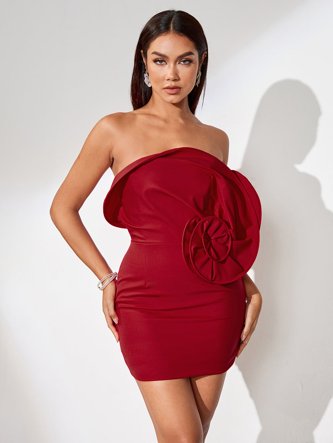 Short dress with flower detailing in a beautiful wine red colour. Designed with precision and crafted from luxurious fabrics, this ensemble effortlessly blends elegance with modern sophistication. Perfect for grand occasions, parties, or special evenings, it promises a flattering fit and an unforgettable impression. Style it with statement accessories and heels to complete your look.
