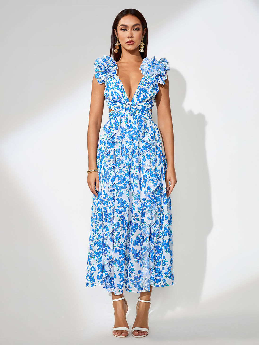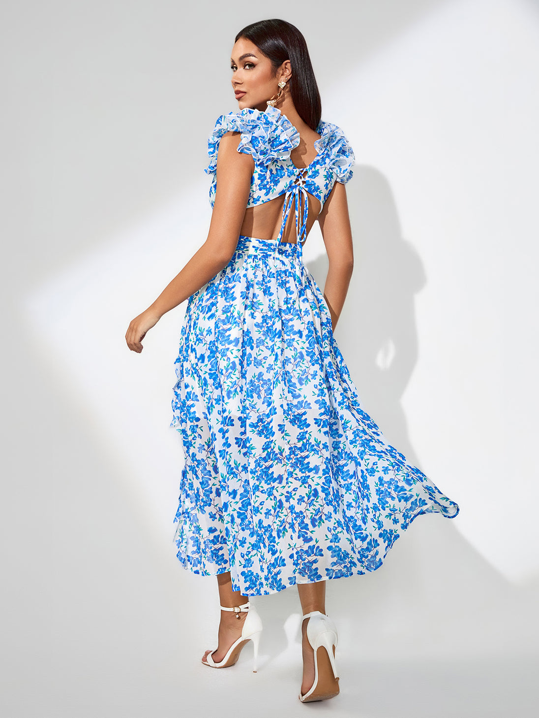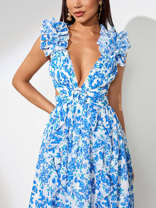 This dreamy blue floral dress features flutter sleeves, a back tie-up, and a subtle slit, creating a graceful silhouette. Ideal for brunches or beach weddings, style it with delicate jewellery and strappy sandals.
