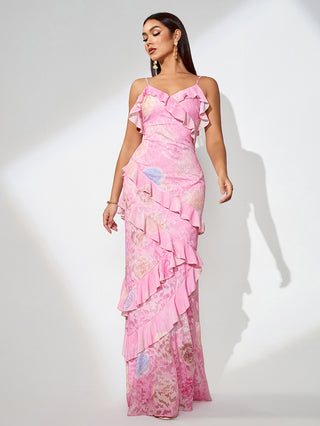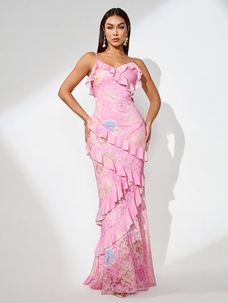 A flowy pink georgette dress adorned with dainty ruffles, perfect for both day and evening events. Light as air and flattering for all shapes, style it with soft curls and minimal accessories for effortless chic.